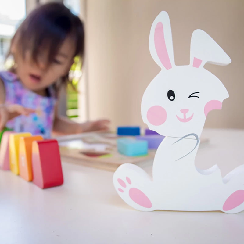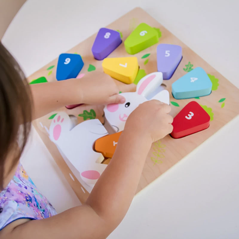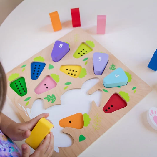 Your child can also match the number dots on the puzzle board to the numbers on the colourful carrots or match the carrot colours to the colour on the board.
