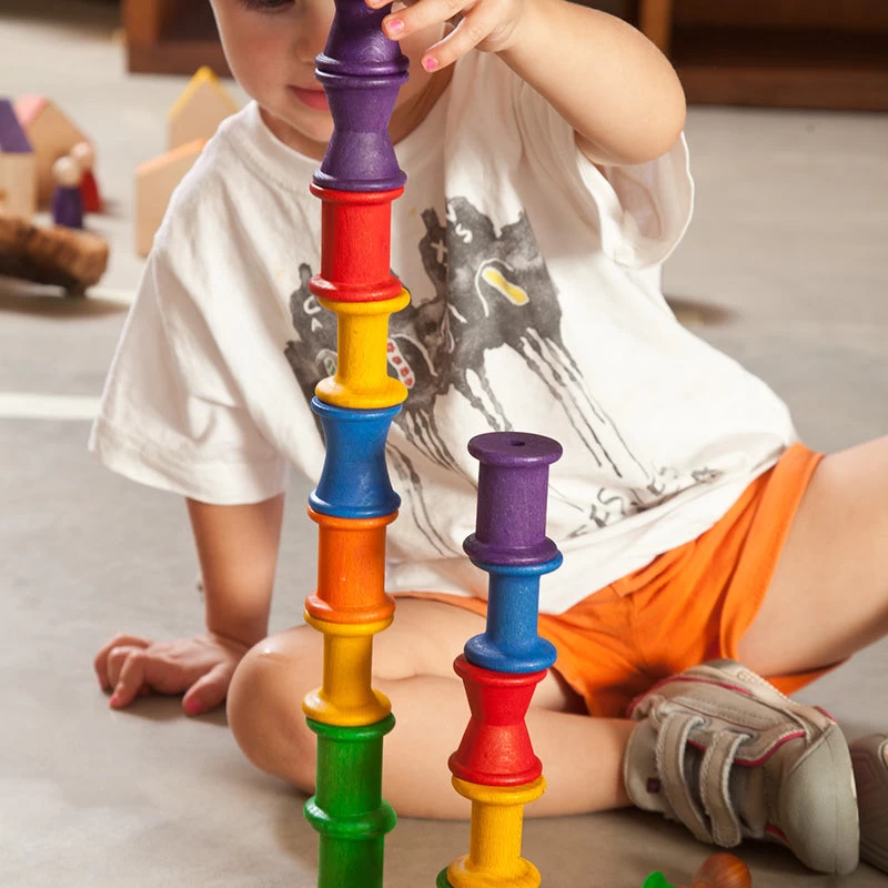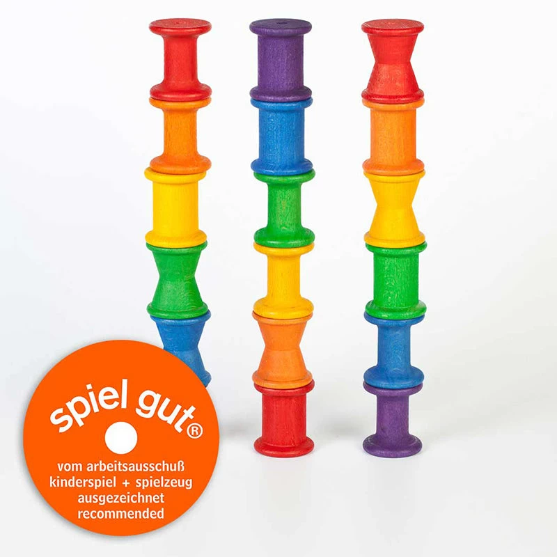 These wooden spools are a timeless classic. Each one of the 18 rainbow coloured spools is beautifully carved from natural and sustainably sourced wood from the Spanish countryside. Wonderful for developing logical, sorting-and-matching, and motor skills. Also great for sensory play with little ones, or for arts and crafts involving strings, ribbons and yarn. Each spool measures 4.5cm tall.