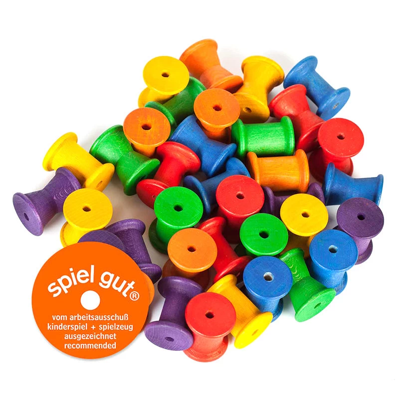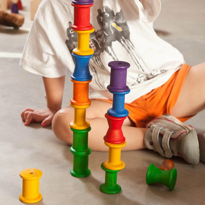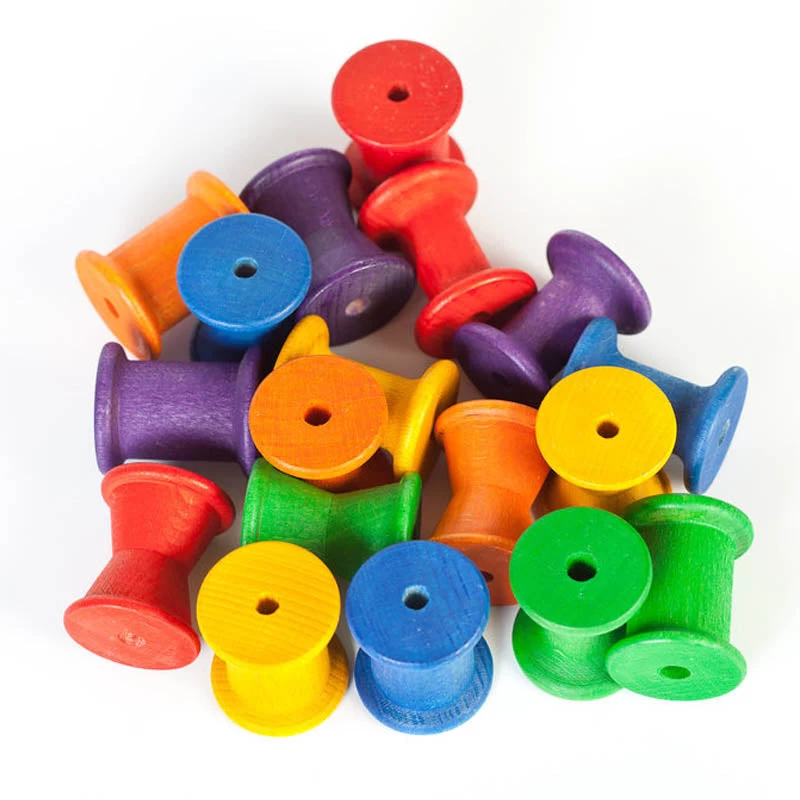 These wooden spools are a timeless classic. Each one is beautifully carved from natural and sustainably sourced wood from the Spanish countryside. Wonderful for developing logical, sorting-and-matching, and motor skills. Also great for sensory play with little ones, or for arts and crafts involving strings, ribbons and yarn. Each spool measures 4.5cm tall.