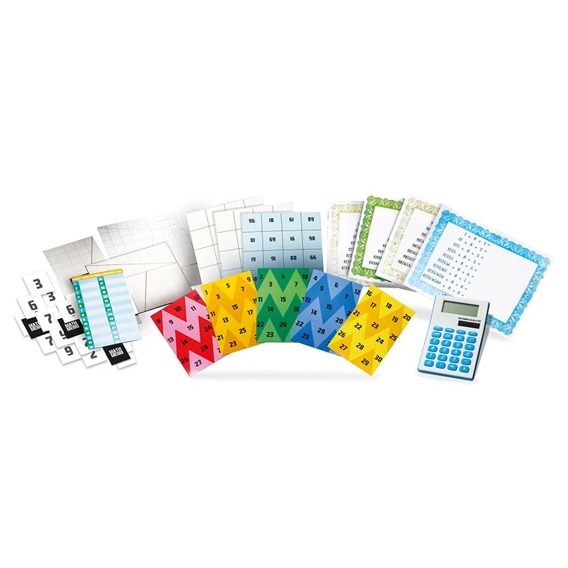 The kit includes a calculator, 2 dice, 1 set magic mind reading cards, magic square card printed with numbers, 1 super magic square, 1 set of beauty math number cards, 40 math memo cards, wired puzzle templates, magic flip puzzle templates, escape paper printed with lines and detailed instructions for over 15 math tricks, puzzles and games, including fun explanations and facts.