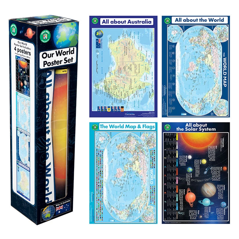 The All About Our World Poster Set includes 4 posters – All about the Solar System, The World Map & Flags, All about the World and All about Australia. Each poster measures 74cm x 50cm.