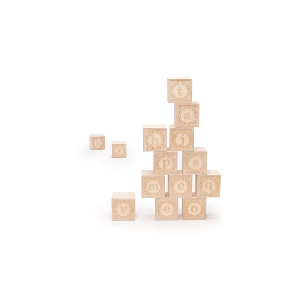 This set of 14 wooden blocks from Uncle Goose contains two sides of embossed lowercase letters on opposing sides. You’ll get one complete alphabet with an additional ‘a’ and ‘e’, along with some blank sides.