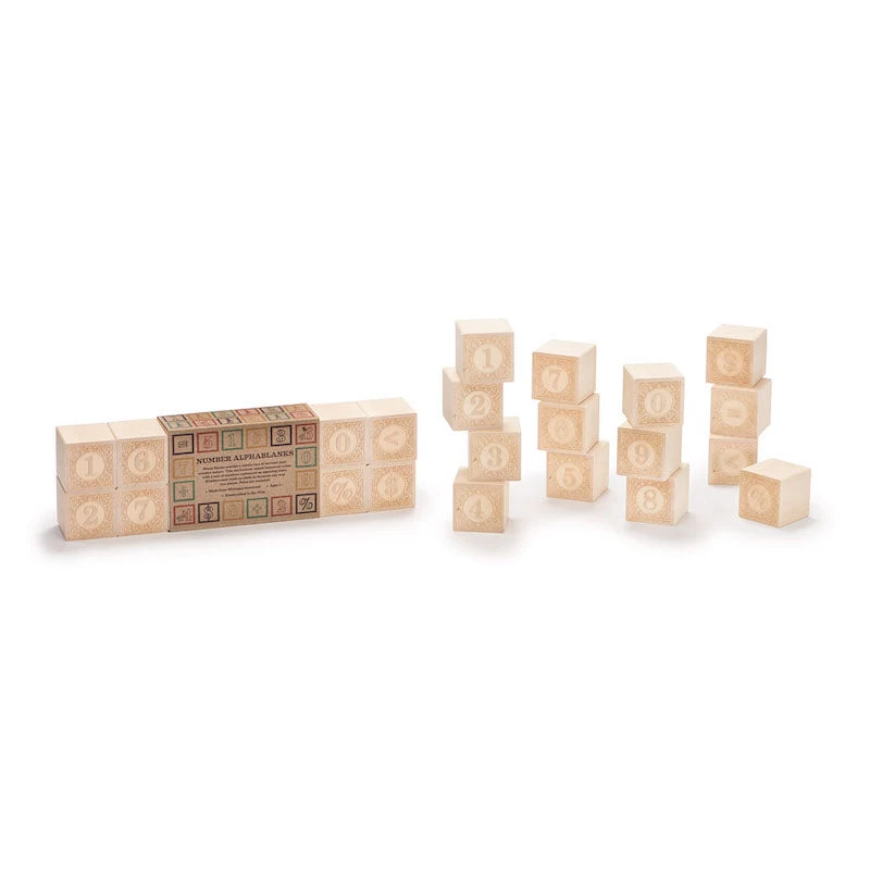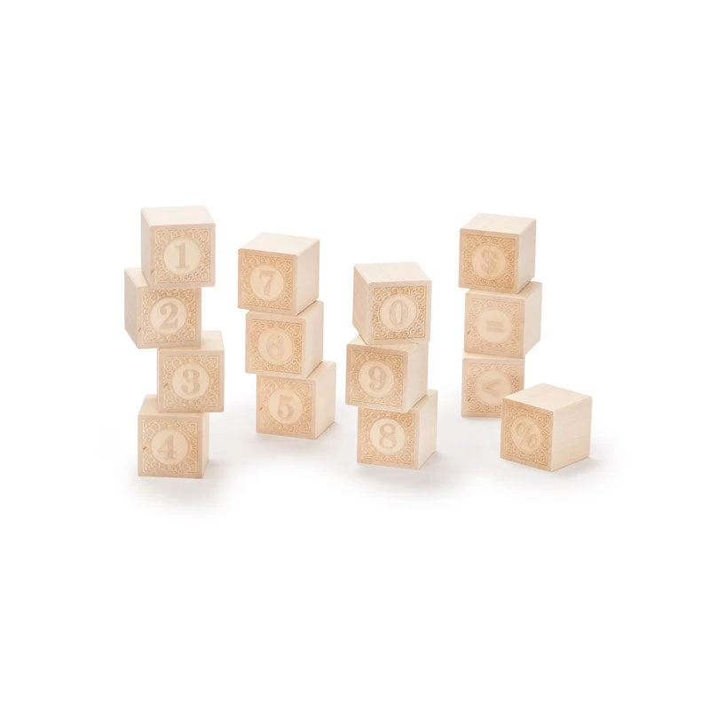 This set of 14 wooden blocks from Uncle Goose contains two sides of embossed numbers, along with some blank sides. Numbers and maths symbols are featured. These stunning non-toxic blocks use child-safe inks and are made from sustainable Michigan basswood. During all stages of production, a skilled pair of hands touches every block, every step of the way. At least 11 master craftspeople inspect all six sides of every block. Block dimensions are 4.5cm x 4.5cm.