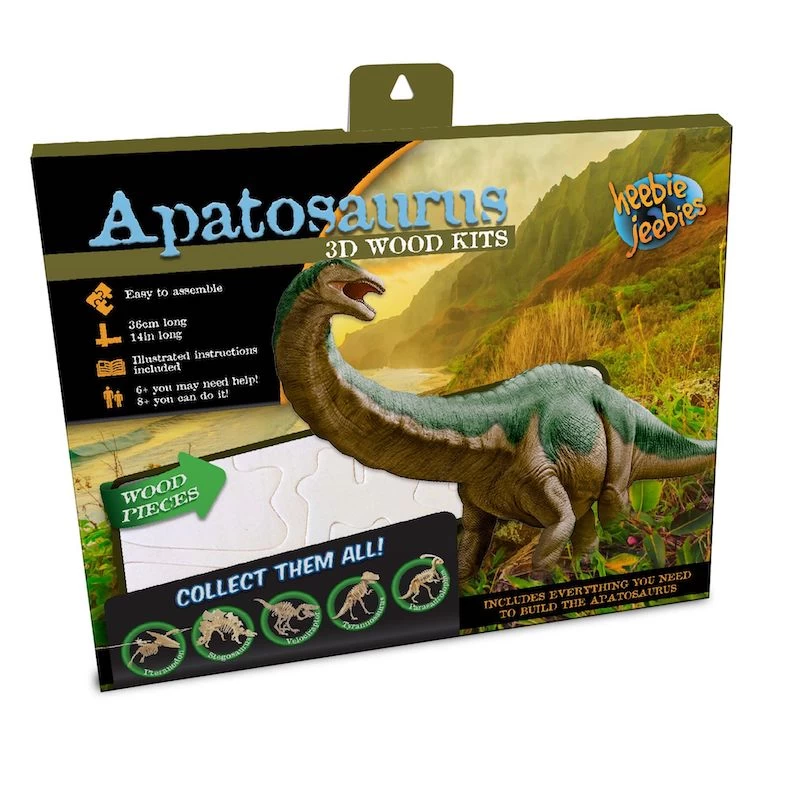 This Apatosaurus wood kit takes 30 minutes to complete and does not require glue. Instructions and sandpaper are included and the model can be painted afterwards however bold imaginations see fit! The dinosaur is 36cm long.Â