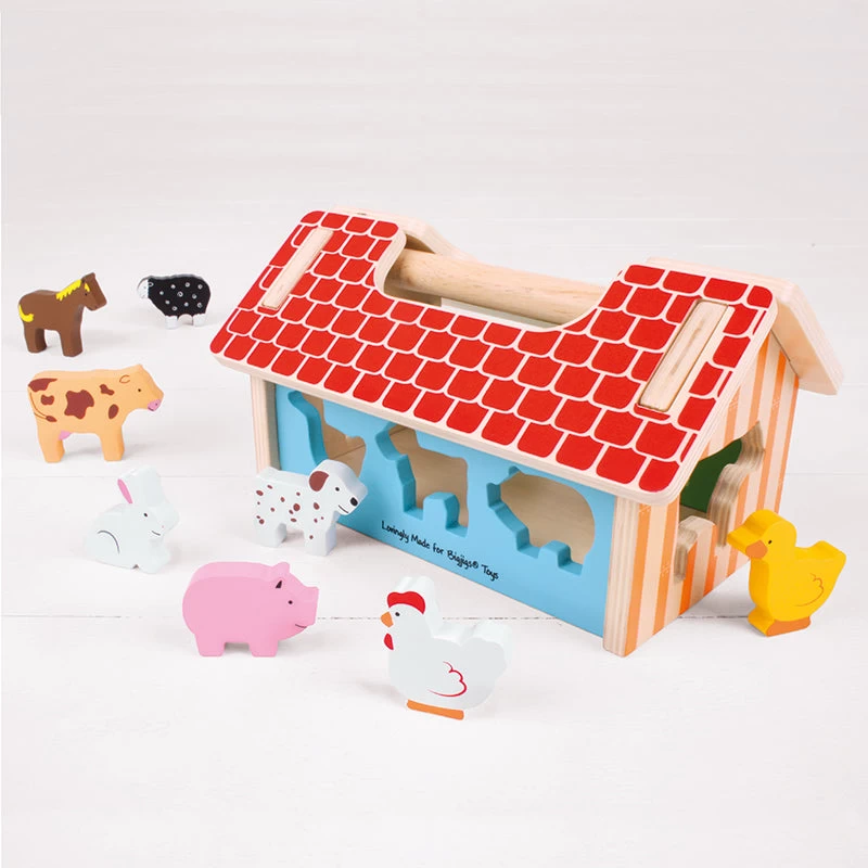 Baa, oink, neigh and moo! Your farmyard friends are ready to play. Discover how the animals fit into the barn with this brightly coloured wooden Farm House Sorter from Bigjigs. Once they are safely inside, carry about in the handy case or remove the roof to pour out the animals for another game.