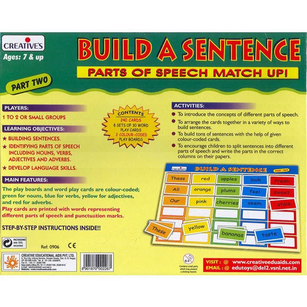 Make learning fun with this literacy activity from Creative’s. Build a Sentence (Part Two) is designed to help children identify parts of speech in order to build simple sentences. It introduces nouns, verbs, adjectives and adverbs and uses colour-coded cards to help children build sentences using the different parts of speech. This activity set can be played solo, with two people or in small groups. It also helps to hone reading skills as children build sentences from the 240 colour-coded cards (green for nouns, blue for verbs, yellow for adjectives, and red for adverbs). This literacy set also includes step-by-step instructions and play boards.