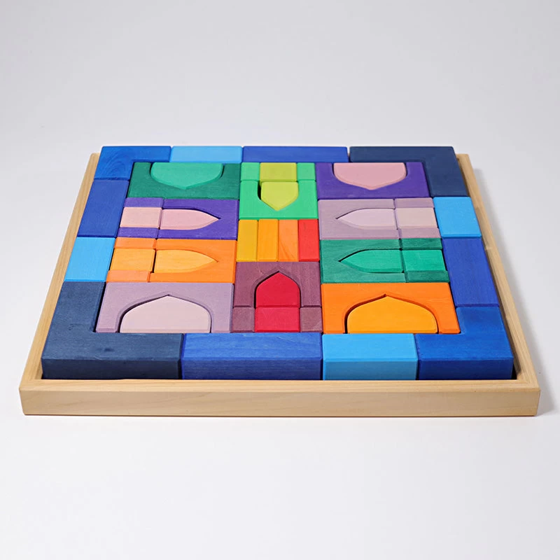 Experience the magical and mystical world of 1001 nights! Children and adults will be fascinated by the intense colours and beautifully formed elements. By building and playing with these blocks, children develop fine motor skills and spatial thinking skills. There are 54 bright rainbow coloured pieces that can be used to form the puzzle inside the wooden base frame. The blocks can also be used for free play.