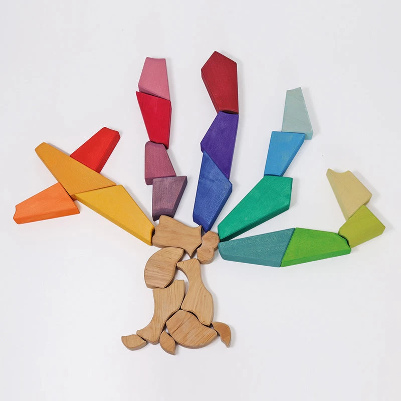 This majestic Rainbow Lion building set from Grimm’s is fascinating both visually and cognitively. There are 27 bright rainbow coloured pieces that can be used to form the puzzle inside the wooden base frame. The blocks can also be used for open ended free play.