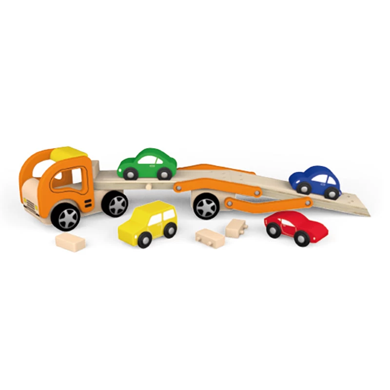 Load and haul four coloured cars anywhere you like with this robust wooden carrier by Viga. The truck and four cars (coloured blue, red, yellow and green) are made of sturdy wood and finished in a bright non-toxic paint. The two-level transporter folds down for easy loading and unloading and the trailer detaches from the truck.