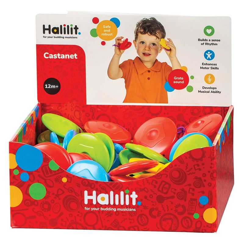 The Halilit Castanet is a perfect introductory musical instrument for your little one. Simply squeeze the castanet together to product a rhythmic clicking, rattling sound. The castanet helps develop musical ability, build a sense of rhythm and enhances fine motor skills. They are a beautiful design, durable and safe.