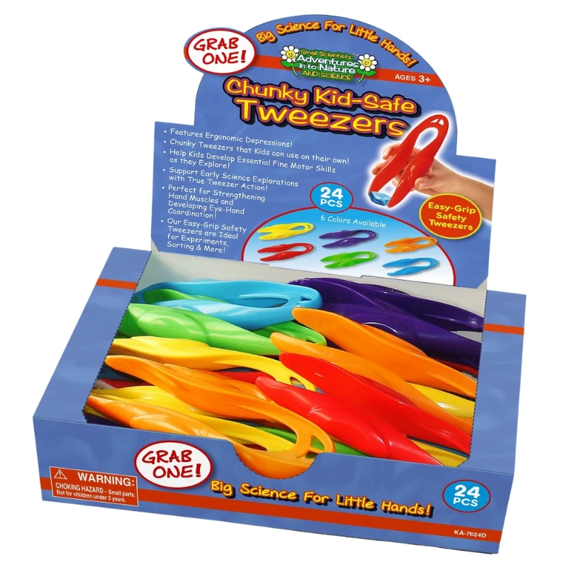 These chunky kid safe tweezers are the perfect size for little hands to hold. They help develop fine motor skills as they explore. They are also ideal to help strengthen hand muscles and to develop hand-eye coordination.