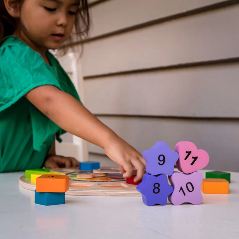 Each number is a different colour and shape and all items are made of wood.
