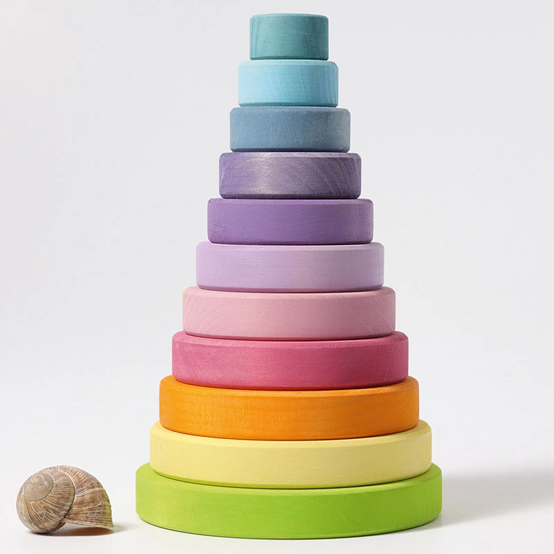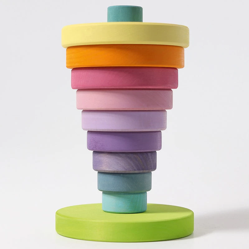 A classic wooden stacking toy from Grimm’s that will provide timeless play, whilst also looking stylish on the nursery shelf. The pastel coloured Conical Stacking Tower with 10 discs allows children to sort, stack and build. This helps develop hand-eye coordination and fine motor skills. Made from lime wood and is coloured with a non-toxic water based colour.