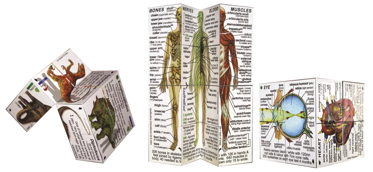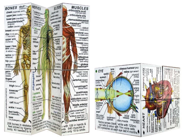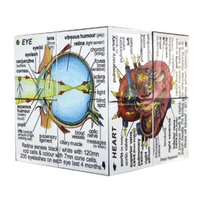 A fantastic informative cube made up of 16 smaller cubes that fold out and back in again displaying different information on a specific topic. This human body model is a fact filled ready reference cube. Follow the hands through the major body systems – eye, ear, heart, lungs, water works, digestion, bones, muscles, blood and nerves.