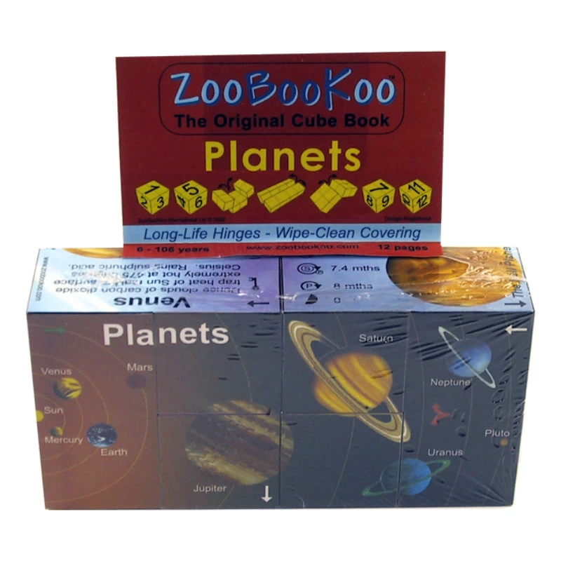 Zoobookoo are fantastic informative cubes made up of 8 smaller cubes that fold out and back in again displaying different information on a specific topic. This planet cube features Solar System Statistics! Slowly learn more and more about outer space as you turn and twist the complex cube. The cube is covered with bright rip-resistant synthetic paper. Age guide: from 6-11 years.