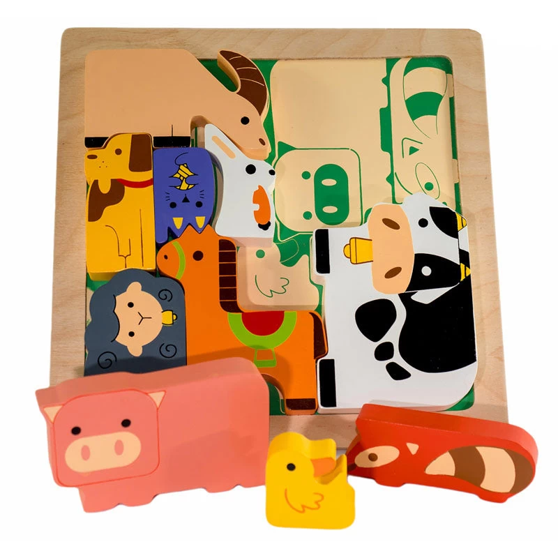 Chunky puzzles are a fun way for small children to improve their fine motor skills. This farm animal chunky puzzle from Kiddie Connect features ten animals that fit neatly into a wooden tray.