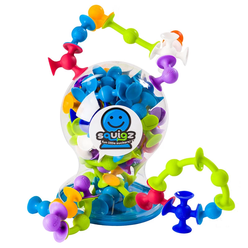 Squigz are fun little suckers! They are a construction toy that’s easy to get stuck on! Push the squishy silicone pieces together and they stick, flex and generally sucker you into creativity. Using Suction Construction, it takes some pull to separate them and they let off a very satisfying POP when you pull them apart. As flexible fellows and committed joiners, Squigz and fellow Squigz have one chief mission — creating things. Willingly, they assemble to become rockets, vehicles, towers, jewellery and more.