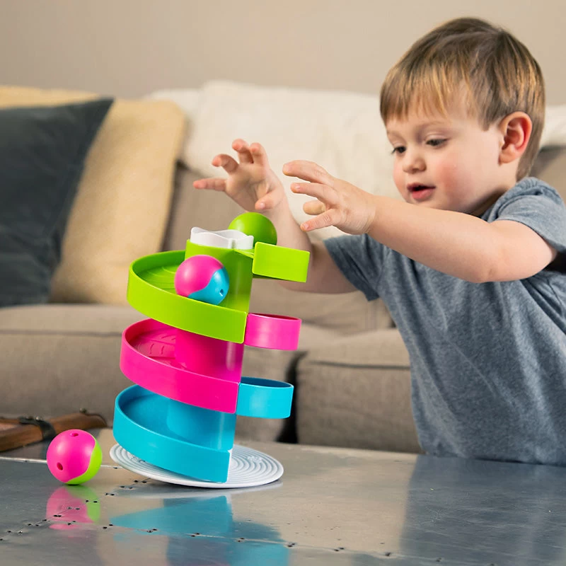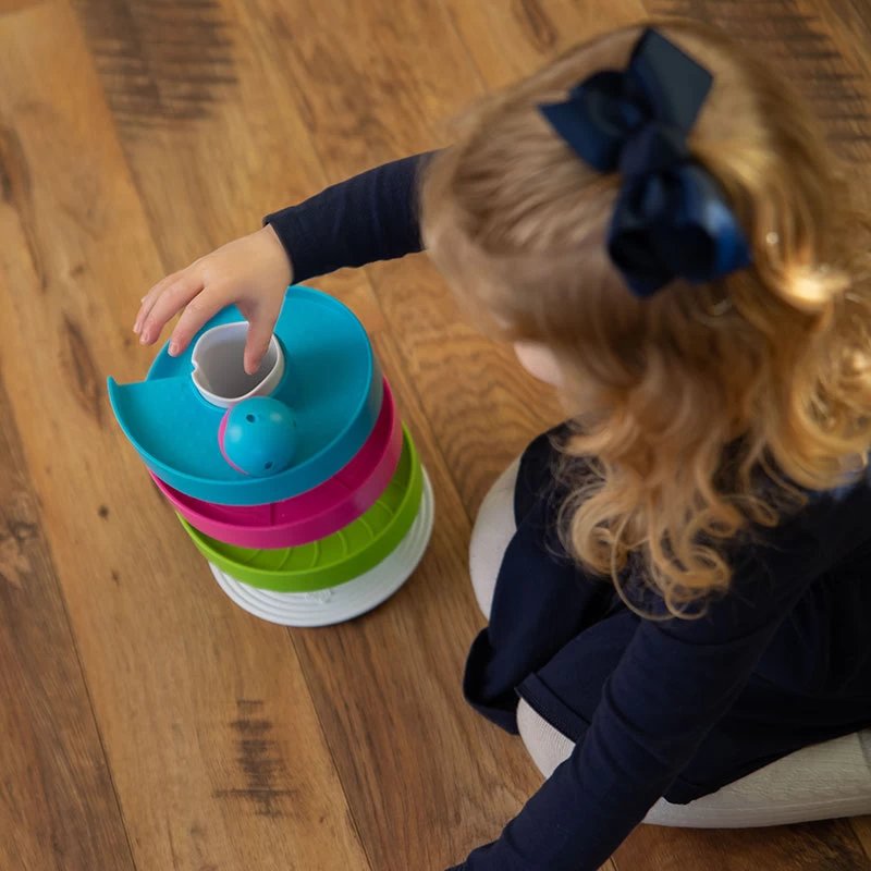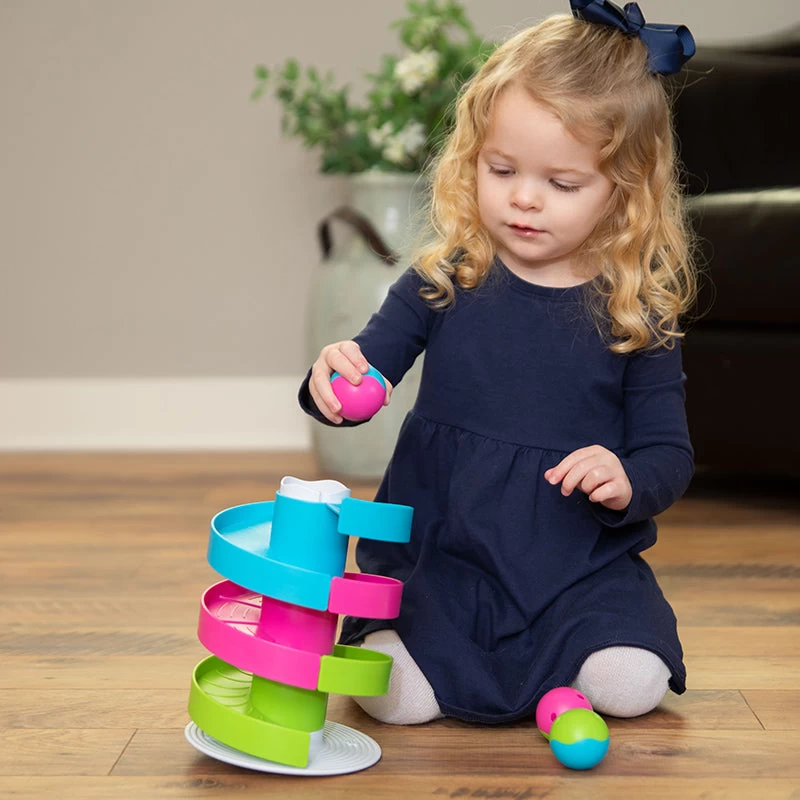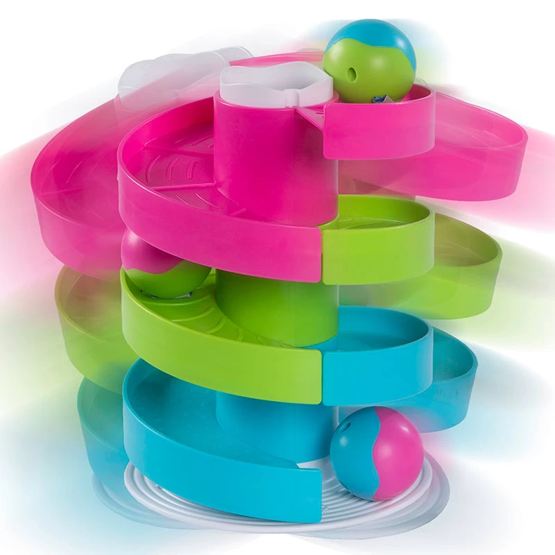 Wobble Run is a classic ball run with topsy turvey fun! Watch it wobble and move around and around. There are three textured, interchangeable tracks which slide on to the tower in any order you want. Simply drop one of the balls into the top and off it goes rolling around the track making fun sounds along the way! When finished the balls store neatly inside the tower.