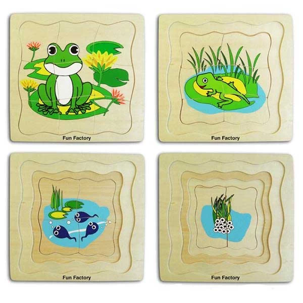 This layered puzzle from Fun Factory is a fun way to learn the life cycle of the frog. The first layer is a two piece puzzle of eggs. The second layer is four pieces showing tadpoles. The third layer is six pieces and shows the tadpole turning into a frog. The top layer is nine pieces and shows the frog on a lily pad.