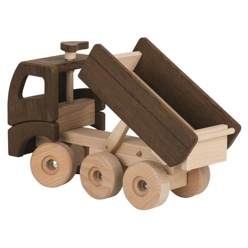 Made in Europe, this dump truck is made from wood that is heat treated to produce a dark timber for the trailer sides and cab leaving it chemical and varnish free.