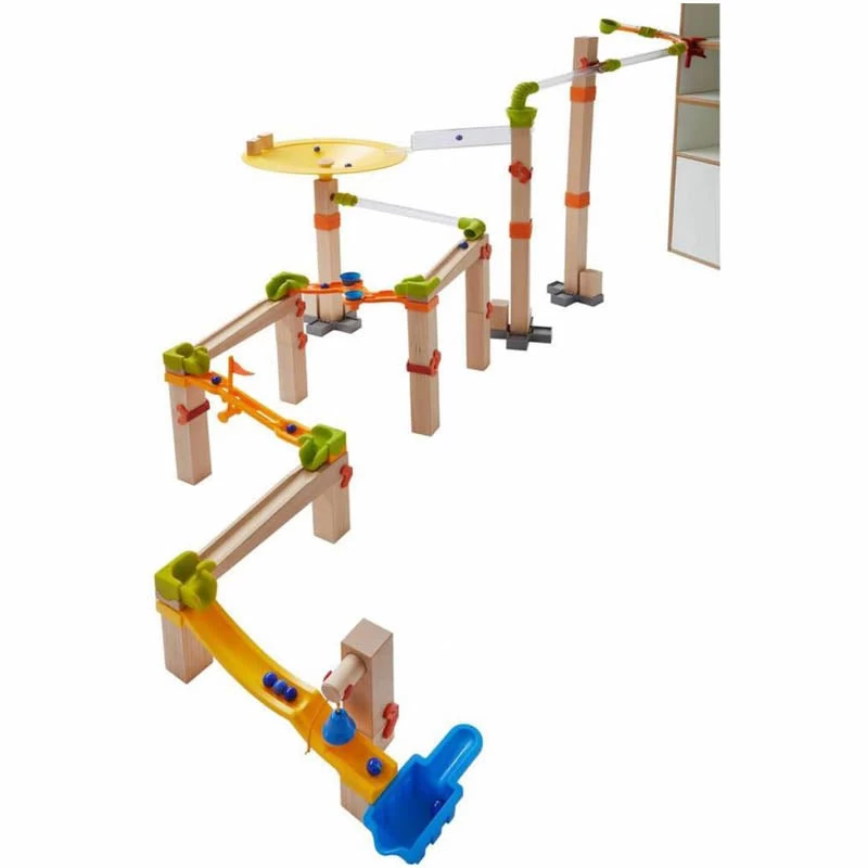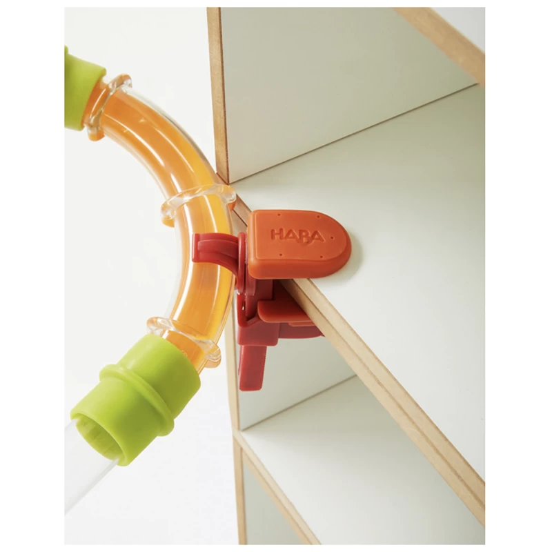This Haba ball track master construction kit offers ultimate building fun! There are loads of pieces which allow many different set up options. A major feature is the sophisticated universal clamp with tube clamping function, as it takes ball track construction to new heights. Attach it to a table top or shelf to create an even greater fall, resulting in maximum marble speeds.Â
