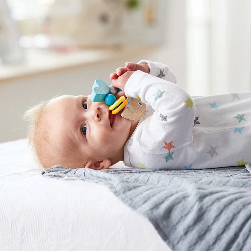 This German made fish clutch toy from Haba will delight little ones with it’s rattling sounds and sweet pastel colours. Helps to develop fine motor skills and first clutching.