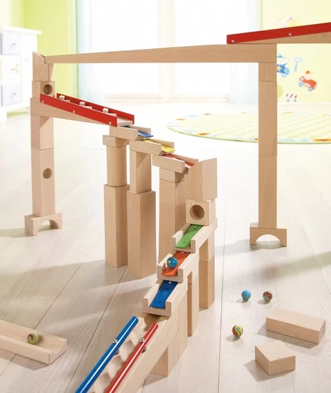 Children love to experiment with sounds and tunes. Arranged in the correct order, the melodious building blocks form a pentatonic scale. Contains one track (32x4cm), nine building blocks, six melodious blocks and six marbles. Compatible with all components of the Haba ball track marble run system (shown in other picture). Please note: the marble run is sold separately and its image is used as reference only.