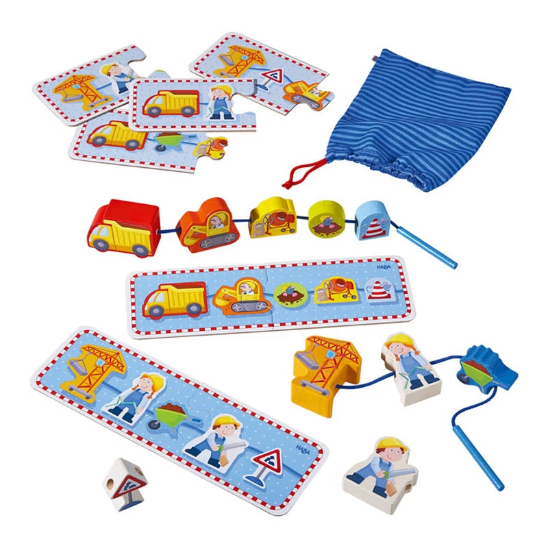 Put little hands and minds into action with this wooden threading Building Site Game from Haba. This Threading playfully trains fine motor skills, while the varying colours and shapes arouse childish curiosity. The template cards show threading variations to hone concentration and observation. The game includes 1 crane with threading cord, 1 wheelbarrow, 2 construction workers, 1 mole, 1 site sign, 1 truck with threading cord, 1 excavator, 1 pylon, 1 cement mixer, 4 templates and a bag to keep the pieces in.