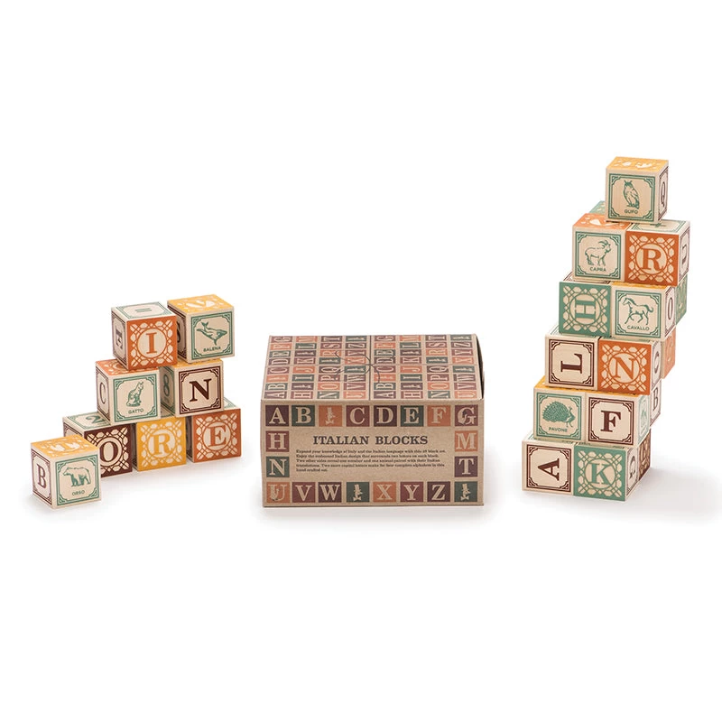 Italian ABC Blocks – This 28-block Italian language set features letters, numbers and animal pictures; all in elaborate and classic detail. They will capture imaginations and become part of building, stacking and sorting play; honing eye-hand coordination; but also teach young ones to say Ciao! Entirely in Italiano, these stunning non-toxic blocks use child-safe inks and are made from sustainable Michigan basswood. Block dimensions are 4.5cm x 4.5cm.Â