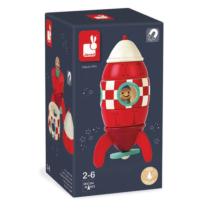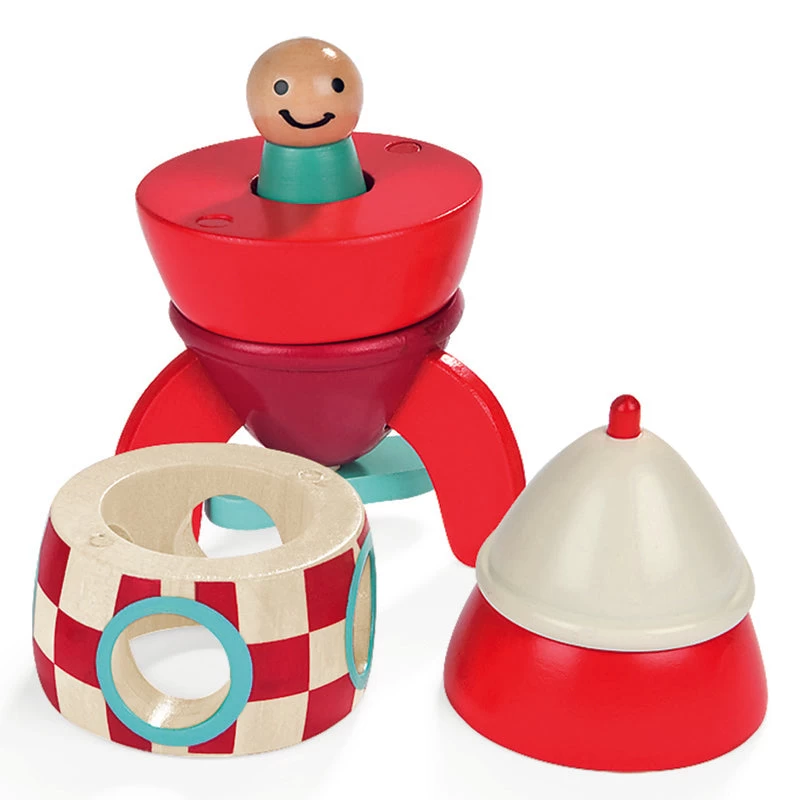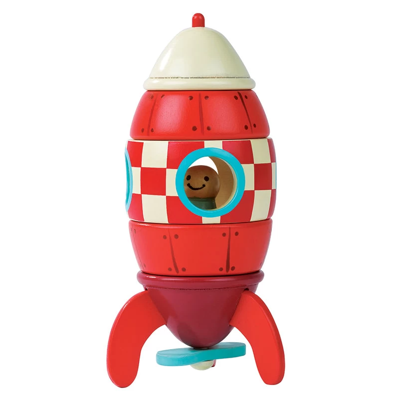 A cleverly designed and versatile wooden toy that is both a puzzle and play item. This rocket consists of 5 pieces that come apart. Each of the pieces is magnetised so when you put it back together, it ‘jumps’ into place. It has a movable propeller and a space man, and is itching to head out on its first inter-galactic flying adventure. Assembled height – 16cm.