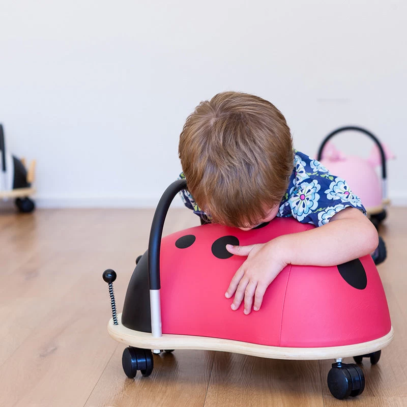 The multi award winning Large Ladybug Wheely Bug moves in all directions on solid castors and promotes gross motor skills and balance. It has a padded sponge layer for maximum comfort. The tough layer of polyurethane leatheroid can be easily wiped clean, and the wooden base is made from plantation grown Poplar plywood and has safe, rounded edges.