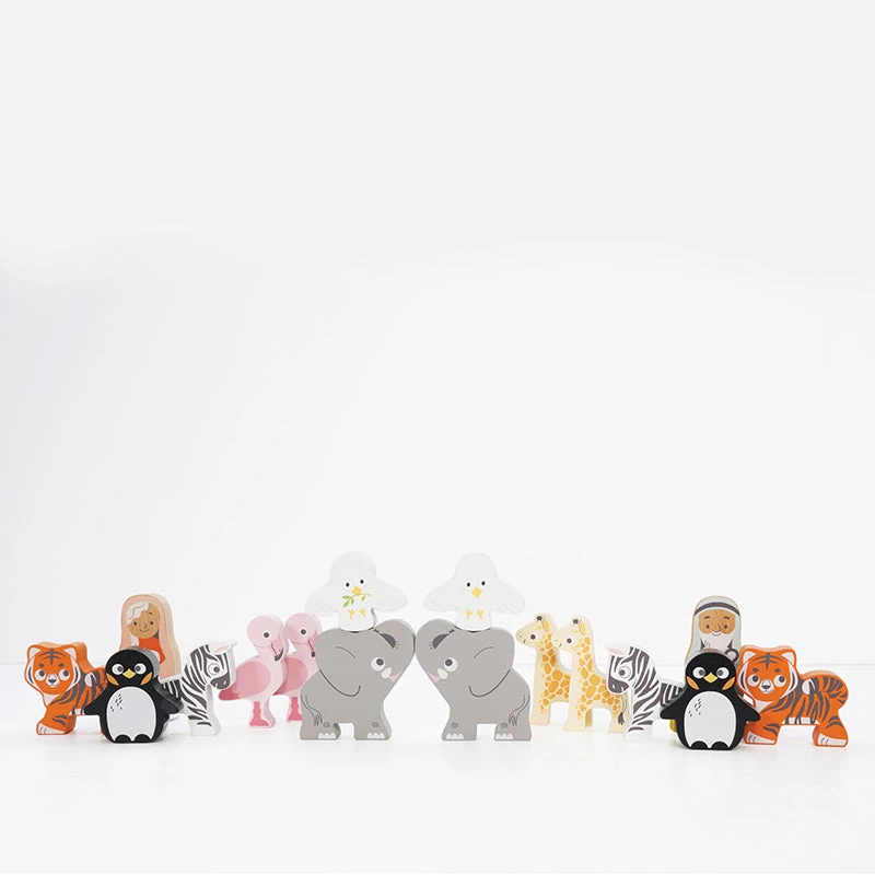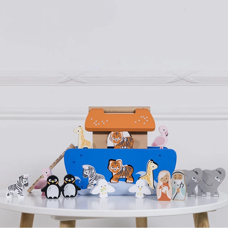 Noah’s ark is painted in bright colours and has seven pairs of adorable wooden animal figurines, and of course, Noah and his wife.Â
