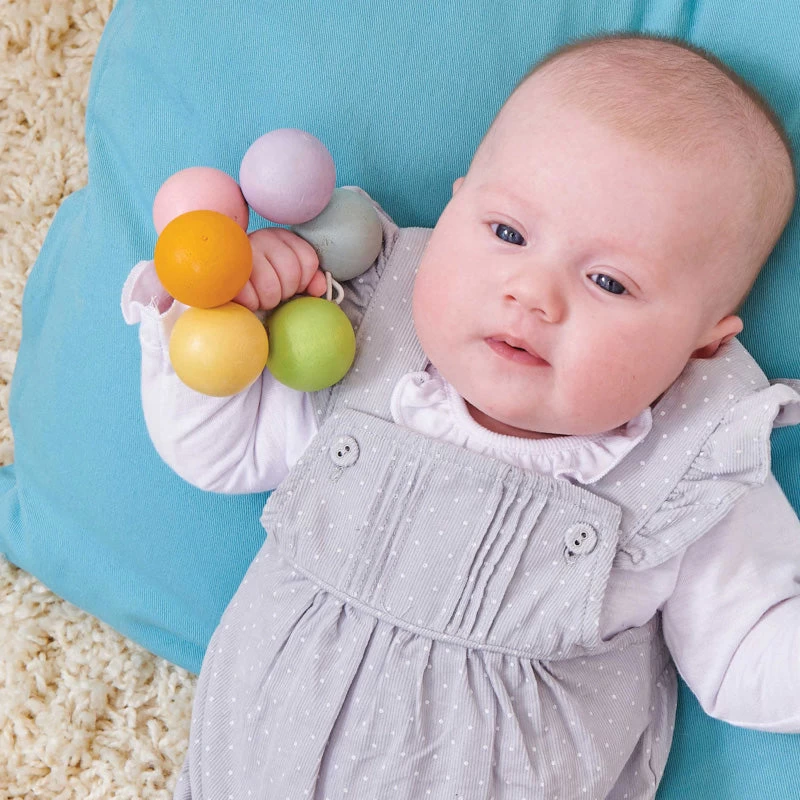 The Petilou Wooden Beads from Le Toy Van will entertain and soothe a teething baby. A colourful collection of 6 wooden beads that are connected by a secure elastic string that allows for movement.Â