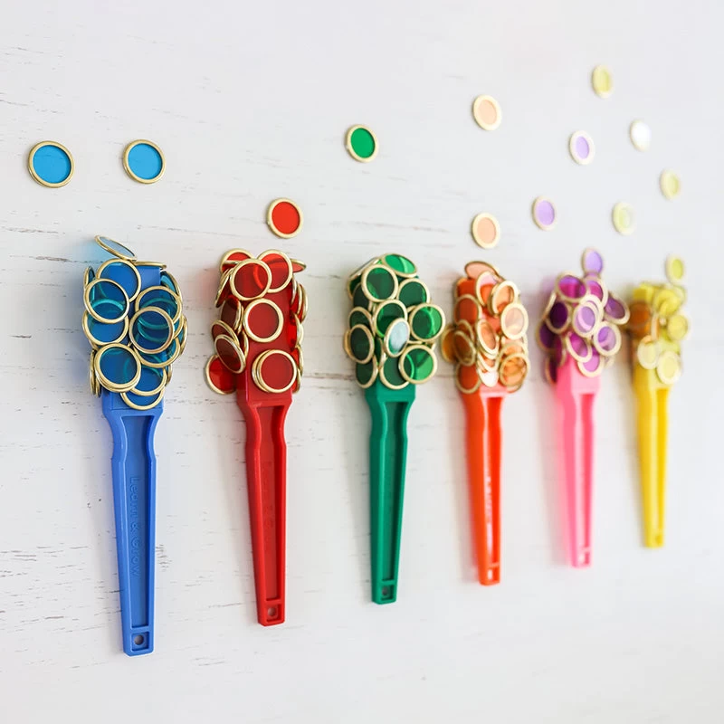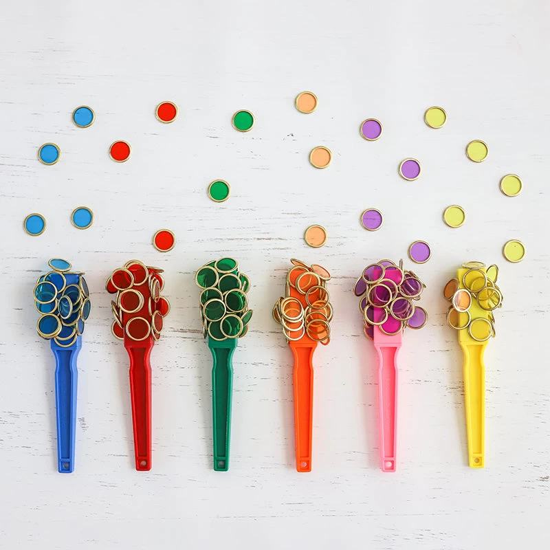 Each wand contains a permanent magnet folded into the end of a brightly coloured plastic handle which is durable and easy to clean.Â