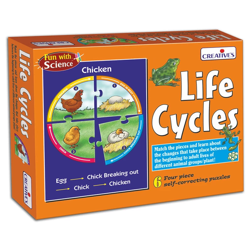 There are six sets of 4 piece life cycle puzzles to create and an activity guide included.
