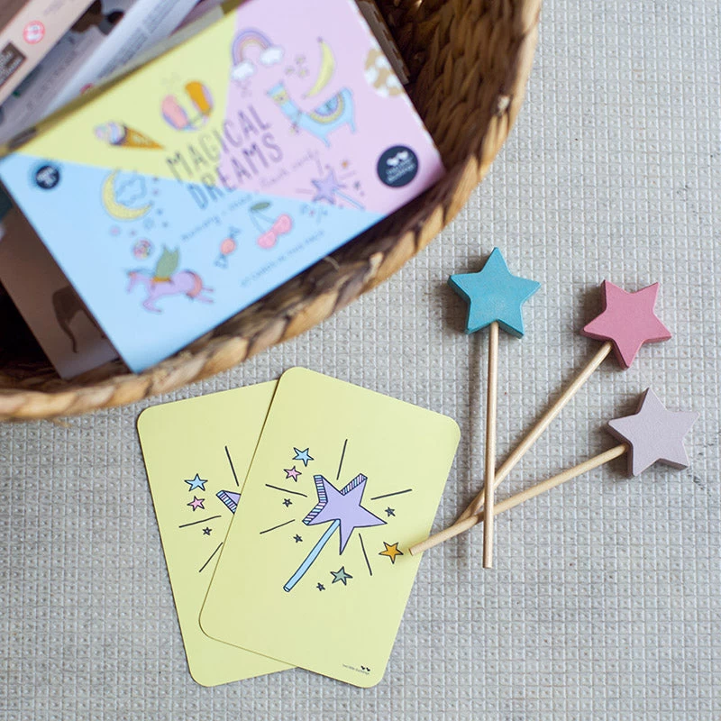 You will have fun playing memory or snap with these easy to read and brightly coloured illustrated flash cards from Two Little Ducklings. The Magical Dreams themed cards have beautifully illustrated pictures of mystical unicorns, llamas, rainbows, ice-creams and more. Each card measures 10cm x 15cm.