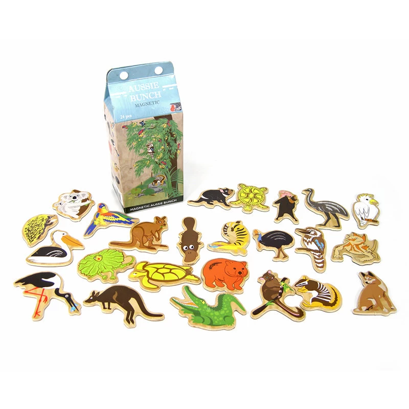 A fun way to learn all about Aussie Animals. This set of 24 magnets is suitable to use on any magnetic surface such as a whiteboard or a fridge. Each animal is cut in a wooden shape and picture printed on top. It all comes stored in a unique milk carton style packaging.Â