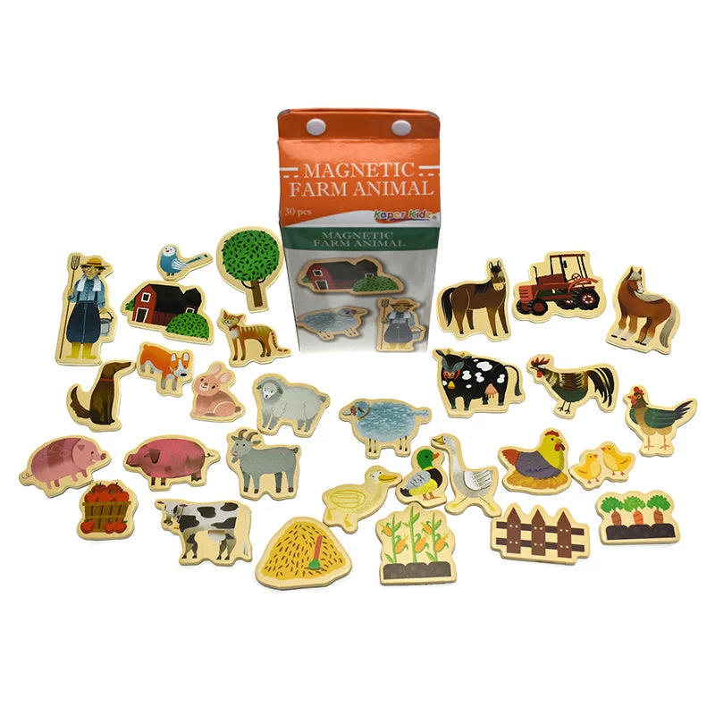 This set of 30 magnets is a fun way to learn all about Farm animals. They are suitable to use on any magnetic surface such as a whiteboard or a fridge. Each magnet is cut in a wooden shape and picture printed on top. It all comes stored in a unique milk carton style packaging.