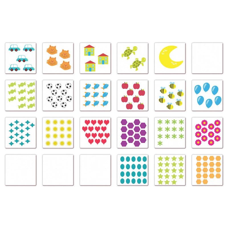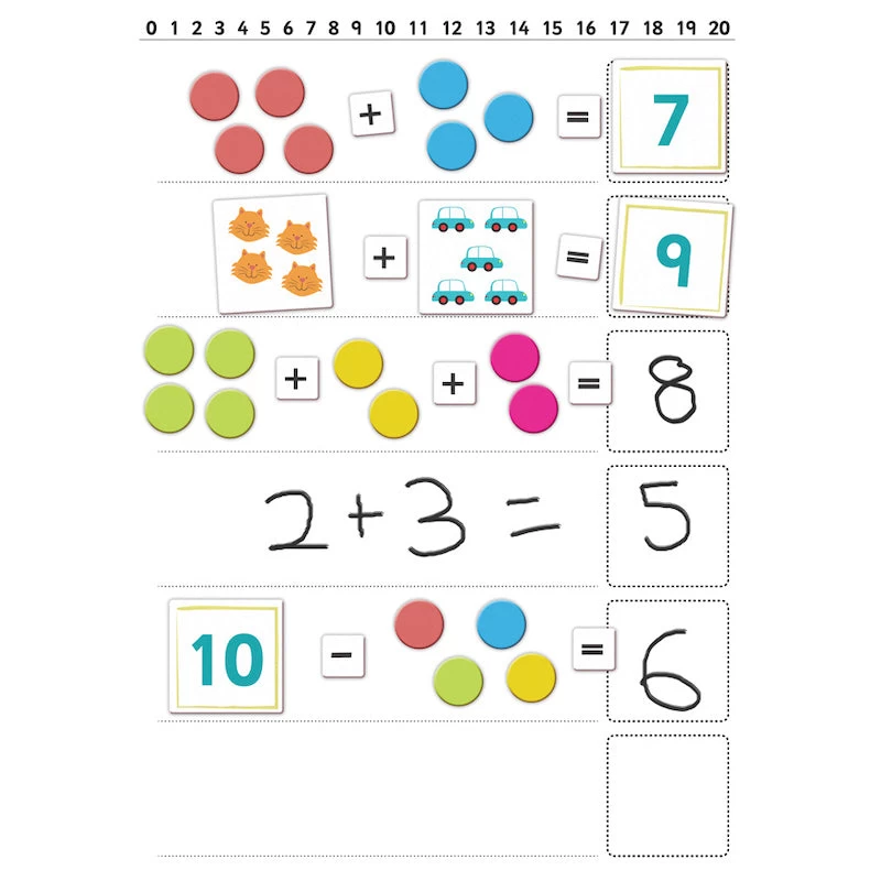 Turn learning to add and subtract into a fun activity with this magnetic First Maths Set by Fiesta Crafts. This set has been designed to visually aid, support and stimulate children as they start their educational journey. Children can count pictures of familiar items like bananas or cars, which make it a more playful exercise than using numbers alone, and the inclusion of a dry-wipe pen to copy numbers helps make this an activity that can be repeated over and over again. First Maths comes complete with a sums and counting board, erasable pen, 108 magnetic pieces and double-sided number pieces from 0-20, as well as seven activities that adults can set children to complete depending on where they are on their mathematical journey.Â