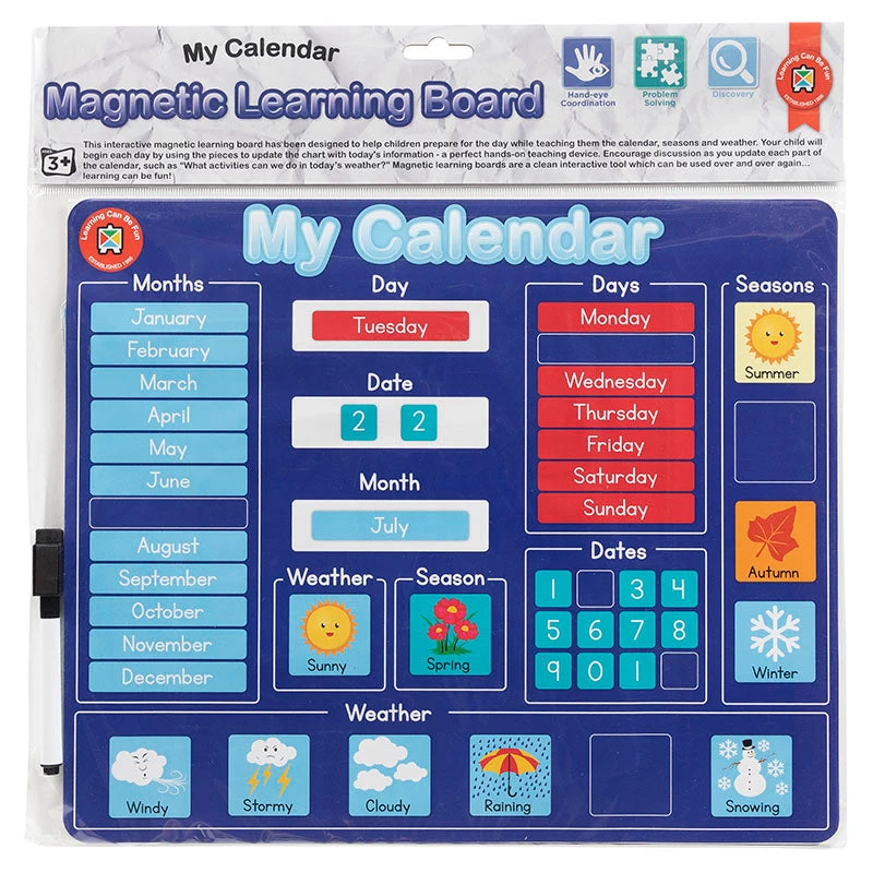 The Magnetic Calendar Learning Board encourages the improvement of early essential skills, like problem solving, discovery, fine motor skills and hand eye coordination.
