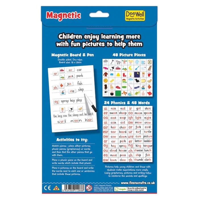 A fun way to learn phonics. This set contains 120 magnetic pieces that have the word on one side with the phonics portion highlighted, and the other side has an image of the word. Included in the set are an erasable pen and backing board to place the pieces and write the word as well. Interactive and fun, it can be used from age 4 years.