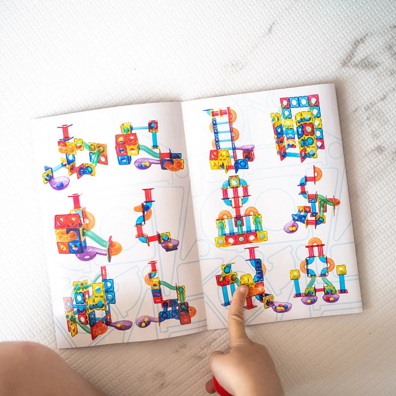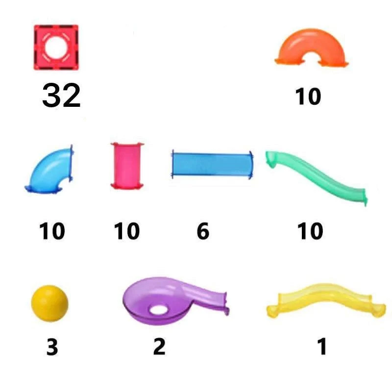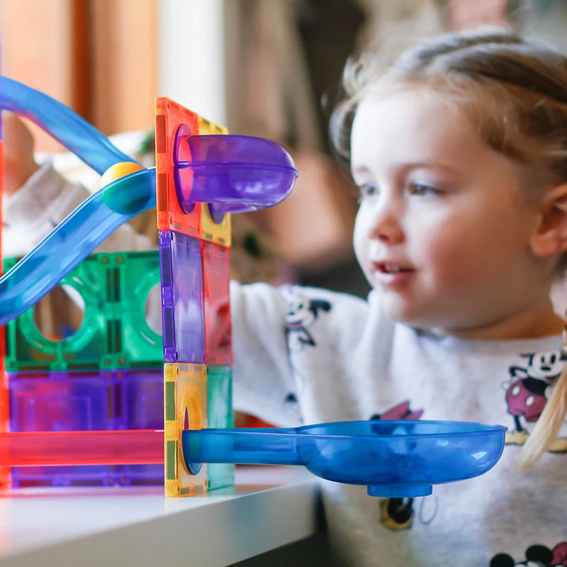 This set includes everything you need to build a complete ball run or pair it with other magnetic tile sets to create a huge maze!