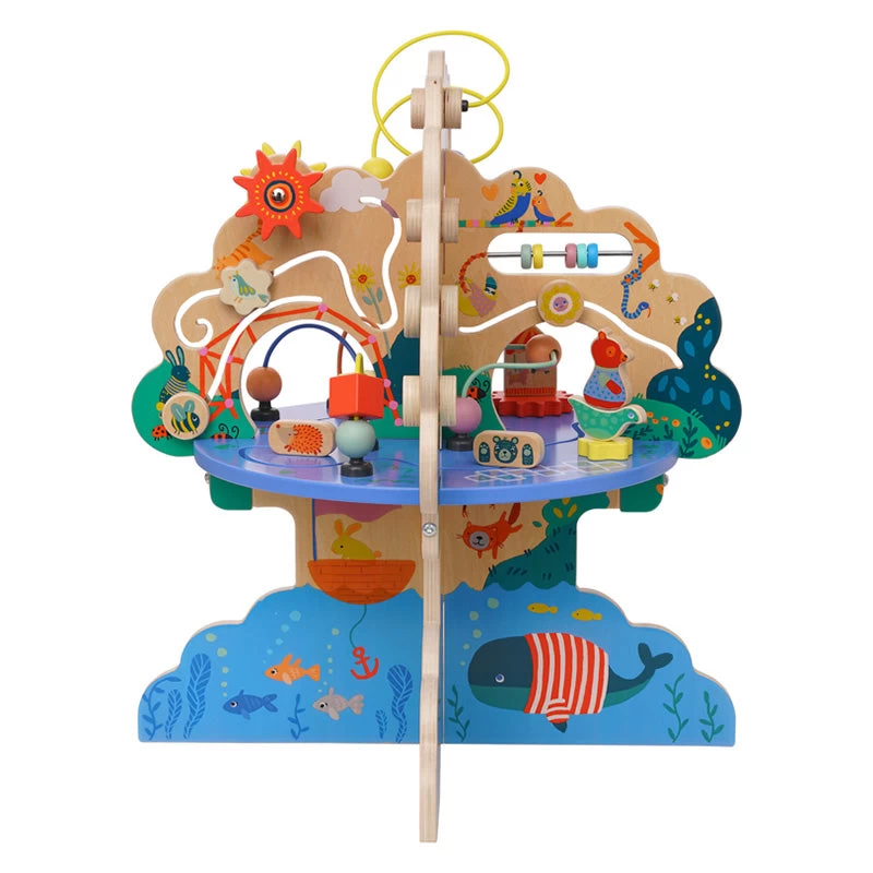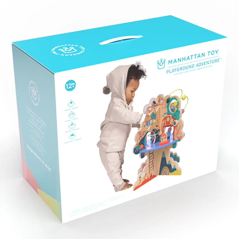 This Playground Adventure Activity Centre from Manhattan Toys is jammed packed with fun features. The table has four separate areas full of colourful and fun interactive activities. There are 20 gliders on 7 different tracks, an abacus, 5 bead runs, 2 spinners, a springy bear riding a dinosaur and more!