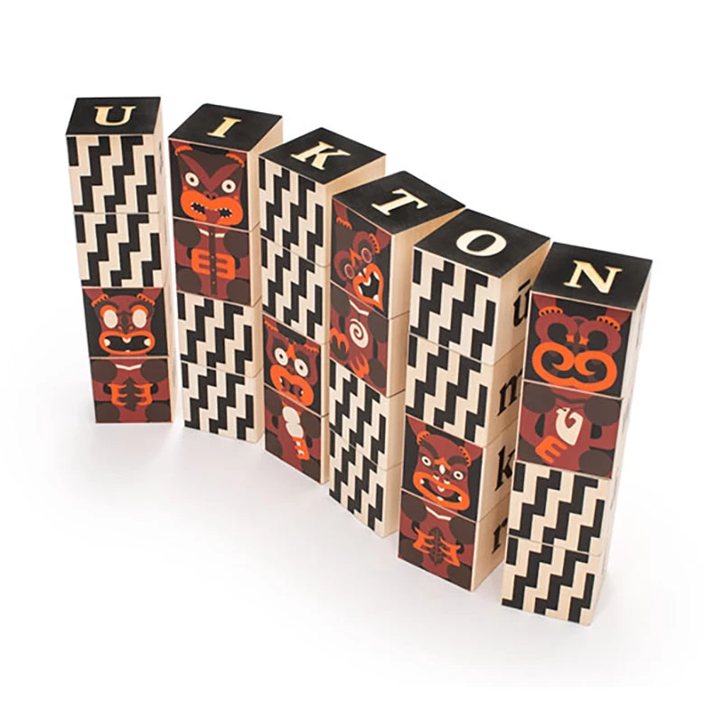 Maori Blocks – This 24 piece block set will expand your knowledge of New Zealand and the Māori language. This earthy Māori language set features upper and lower case letters. Enjoy the marauding gods, zigzag design, numbers, and math symbols. Two debossed sides per block and also includes an information booklet. These stunning non-toxic blocks use child-safe inks and are made from sustainable Michigan basswood. Block dimensions are 4.5cm x 4.5cm.