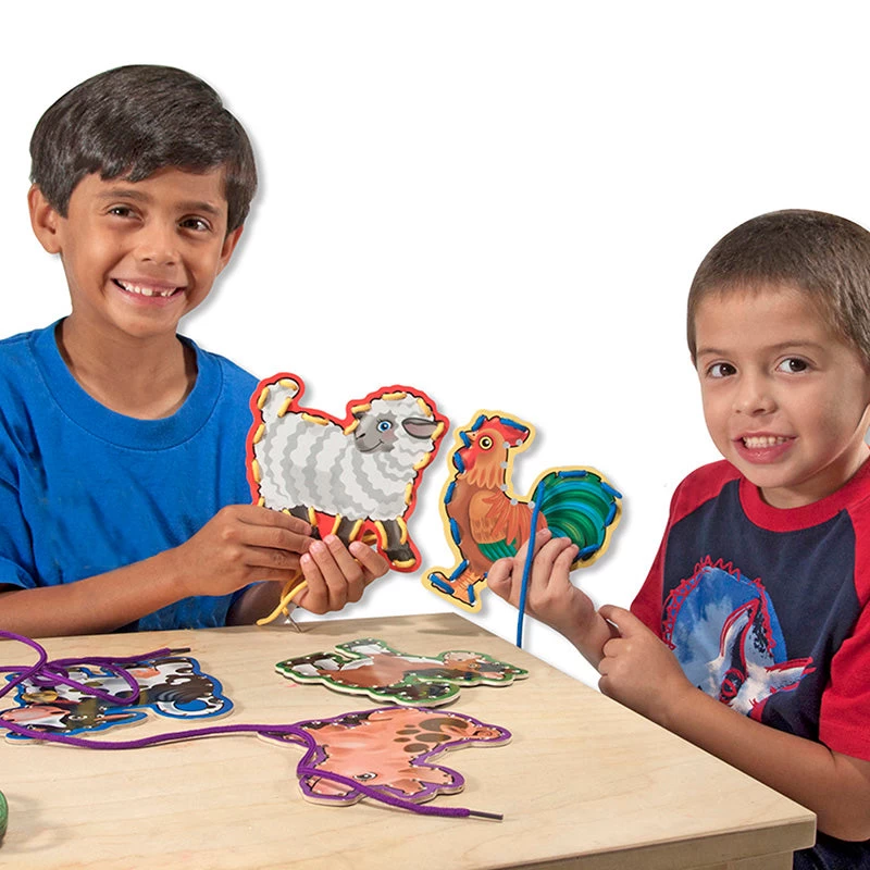A great lacing activity for younger children, Melissa & Doug’s Farm Lace and Trace set will help to develop hand-eye coordination and focus. With cute and chunky farm animals on both sides, children will love to practise lacing and tracing skills with this wooden set. There are five sturdy, double-sided lacing panels, plus five colour-coordinated laces. Cow height – 15cm.