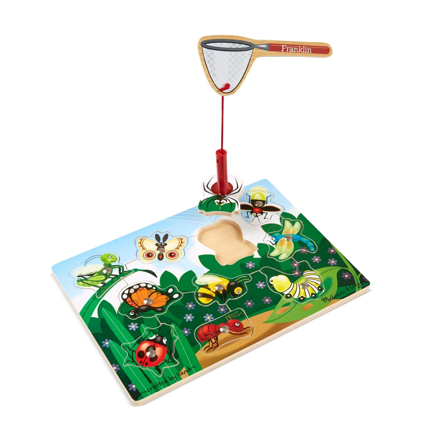 This magnetic wooden puzzle game features bugs and insects in a garden. Use the magnetic butterfly net to ‘capture’ the bug buddies from the game board. Then, enjoy the challenge of returning them to their preferred perch! A creative way to encourage hand-eye and fine motor development.