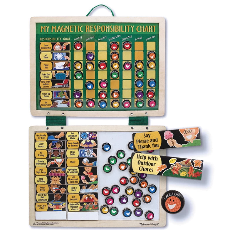 Catch children in the act of behaving well and reward them with a magnet on their hanging chore chart . . . then watch those good habits multiply! Open the fabric-hinged boards to reveal a behaviour chart on one board, while the other board keeps all the magnets close at hand. A sturdy cord is attached for hanging. Includes dry-erase board and 90 magnets, including responsibilities (load dishwasher, make bed, set table etc), positive behaviours (no teasing, show respect, share etc), and rewards (Well Done!, Excellent!, You’re a Winner! etc). Encourages good behaviour with this wooden magnetic tracking-and-reward chart. The hinged board measures 40 x 30cm, when unhinged it measures 40cm x 63cm.