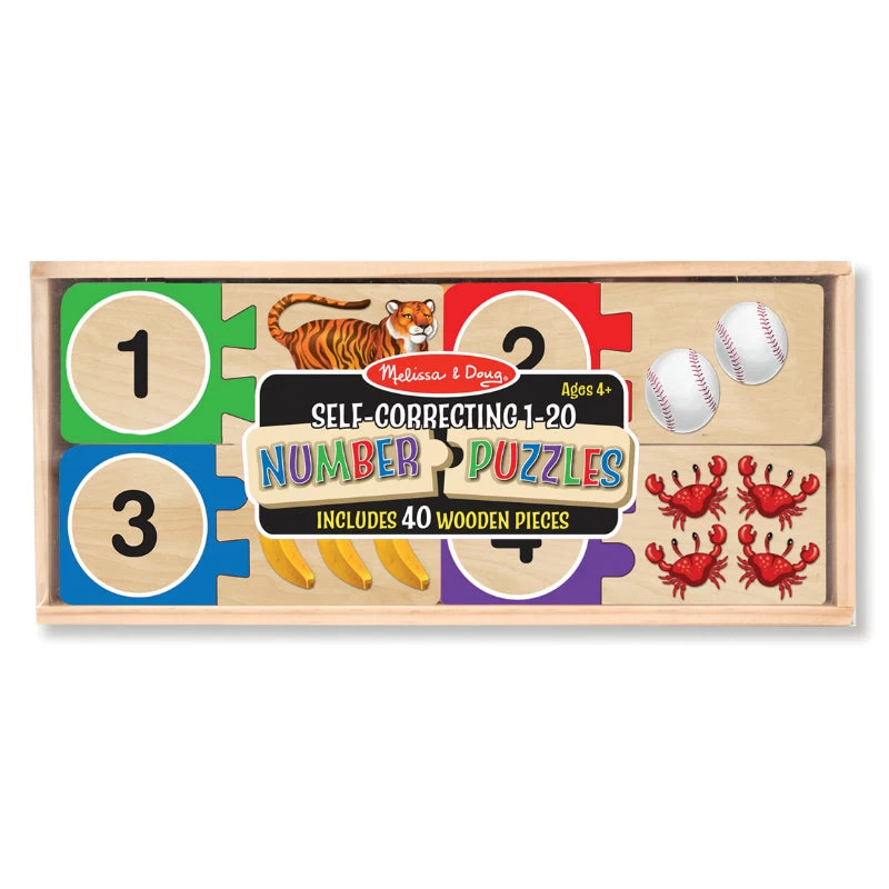 Match these wooden puzzle pairs to make mastering numbers as easy as 1, 2, 3! Groups of objects illustrate the numbers 1-20 and the puzzles are self-correcting. Each wooden puzzle piece fits only with its correct match, so children can work by themselves to learn numbers in a way that’s fun and frustration-free.