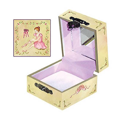 The treasure box has a pretty gold clasp and is 6cm long, 6cm wide and 4.5cm deep. The inside of the box is neatly lined with light pink velvet and there is a white satin pillow for treasures to rest on. Inside the lid there is a square mirror for little ballerinas to catch their reflection. This box is just the right size for special little treasures such as gemstones, rings or perhaps a tooth for the tooth fairy!