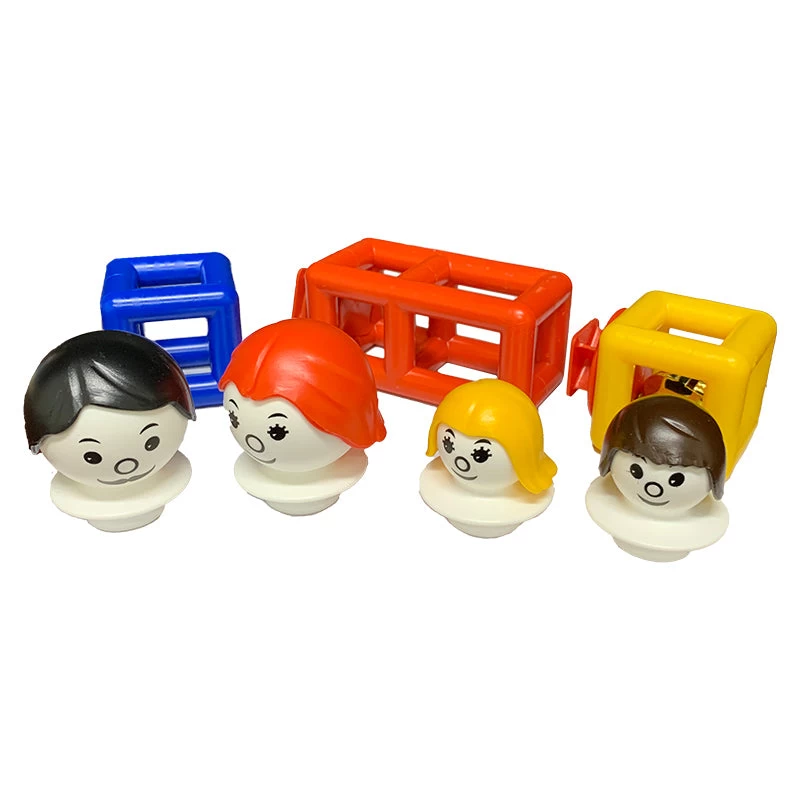 The Mobilo Family Pack contains 2 light adult heads, 2 light child heads, 3 geometric pieces (one containing a bell) and 2 connectors.